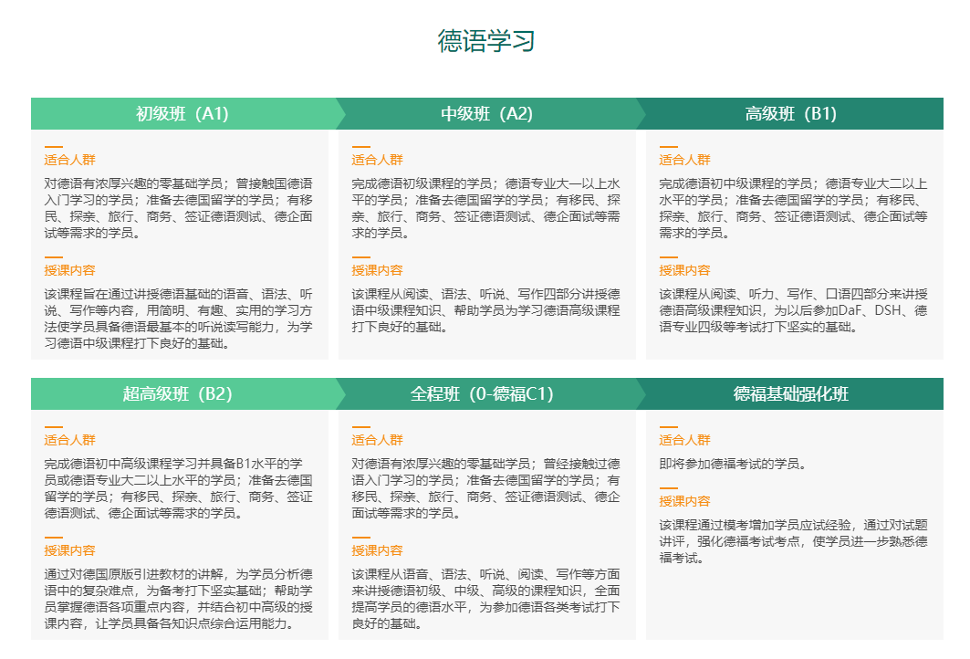 适合学员• 准备去德国留学的学员。以及有移民、探亲、旅行、商务、签证德语测试、德企面试等需求的学员• 想进行系统、完整的德语学习,对服务和学习效果有一定要求的学员包含内容德语全程班零起点-德福Care 德语全程班零起点-德福 德语全程班零起点-歌德B1/B2课程介绍优化学员基础德语应用能力,锻炼学员的应试技巧和全题型解题方法,帮助学员少走弯路,减轻备考压力。