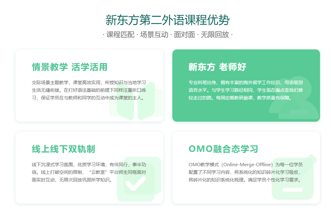 新东方第二外语课程优势· 课程匹配 · 场景互动 · 面对面 · 无限回放 ·